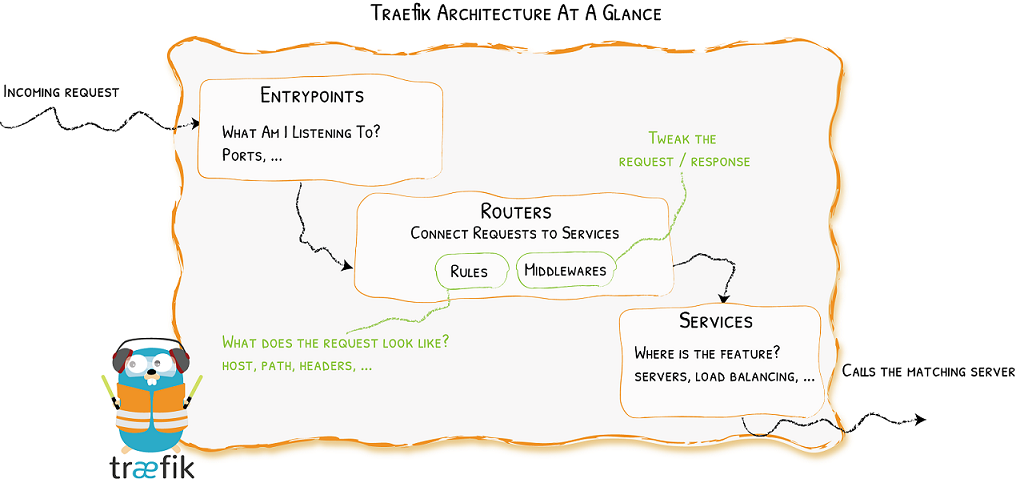 The traffic comes in from the entrypoints. The routers grab a request based on a specific rules (matching) tweak and send the request forward to the service. The service knows where to (server/application) send the request.